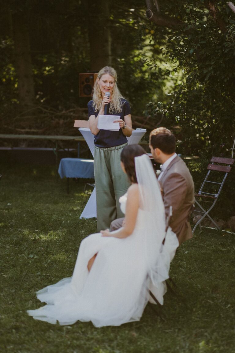Mein Wunsch ist, dass ihr Euch fallen lassen könnt… ich darf dafür bei der Trauung eine besondere Atmosphäre schaffen und Euch überraschen – mit einer herzlichen, ergreifenden Rede und mit ganz viel Liebe zu persönlichen Details. Wir haben unzählige Gestaltungsmöglichkeiten und ich führe Euch & Eure Gäste sicher durch die komplette Zeremonie – alles andere als langweilig!